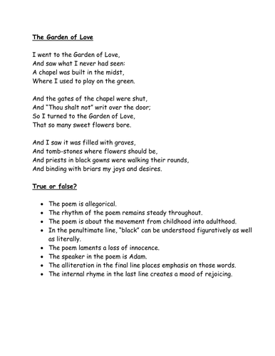 True Or False Quiz On The Garden Of Love Blake Teaching